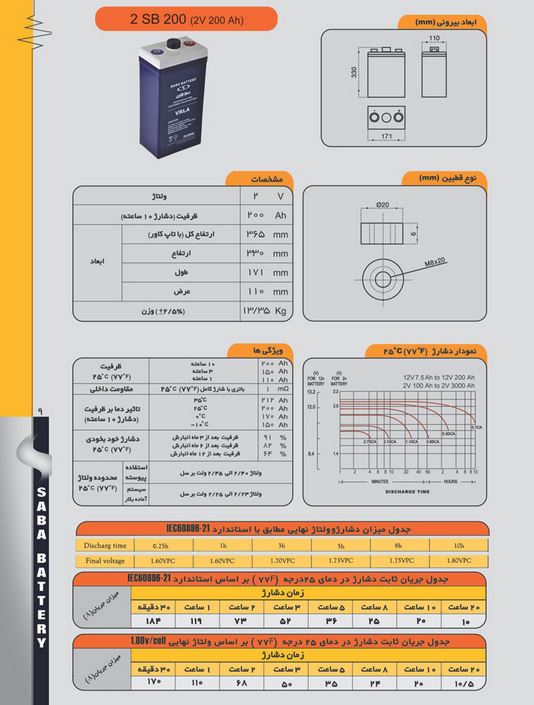 مشخصات باتری 200 آمپر 2 ولت سیلد اسید صبا
